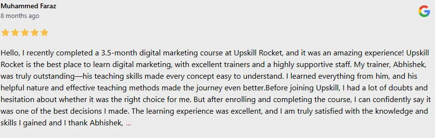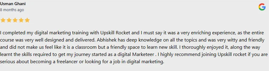 Upskill Rocket Landing Page India's #1 Ranked Digital Marketing Training Program Learn From Industry Leaders 100% Placements | Tools Worth INR 45,000 For Free Most Advanced Digital Marketing Course in Bangalore A.I Based Digital Marketing Training in Bangalore 100% PlacementLive Practical ProjectsLive Budget For Every StudentLMS AccessFlexible Learning OptionsInternational CertificationsTraining Global Industry Leaders Download Course Details Download Brochure Learn 35+ Modules While Working on Live Agency Projects A.I Chat GPT & Automations Also Covered 35+ Modules 15+ certifications 120+ Pro Tools 8+ Live Projects Premium LMS & A.I Based Modules 100% PlacementsWithin 2 Weeks Live Campaign Budget Online & Offline Classes Schedule a Free Demo Class Tools Worth INR 45,000 for FreeOnly with Upskill Rocket ! Join Proud Community of Upskill Rocket Students ! For Free Counselling Call Us On : 888-4477-222 Download Complete Course Details Download Brochure Training Options: Offline Classes Online Classes Hybrid Classes Get In Touch Now Call Us On : 888-4477-222